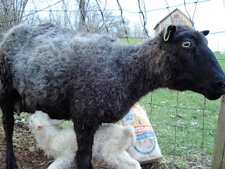 Felecia's twins! Little white ewe and black ram with a "lightning butt"